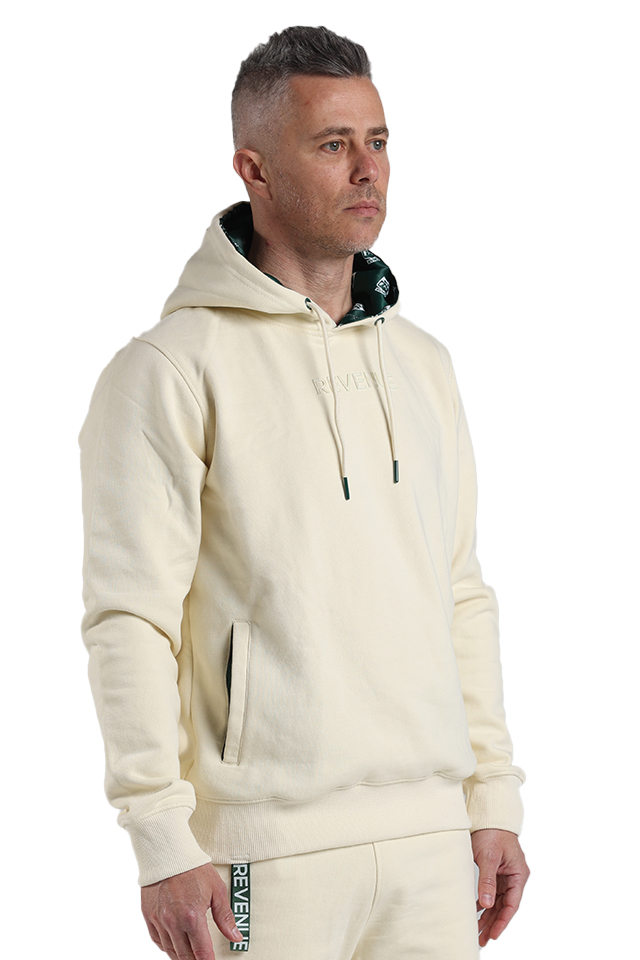 The tone-on-tone 5″ REVENUE logo Hoodie in our signature Paper Colour base.