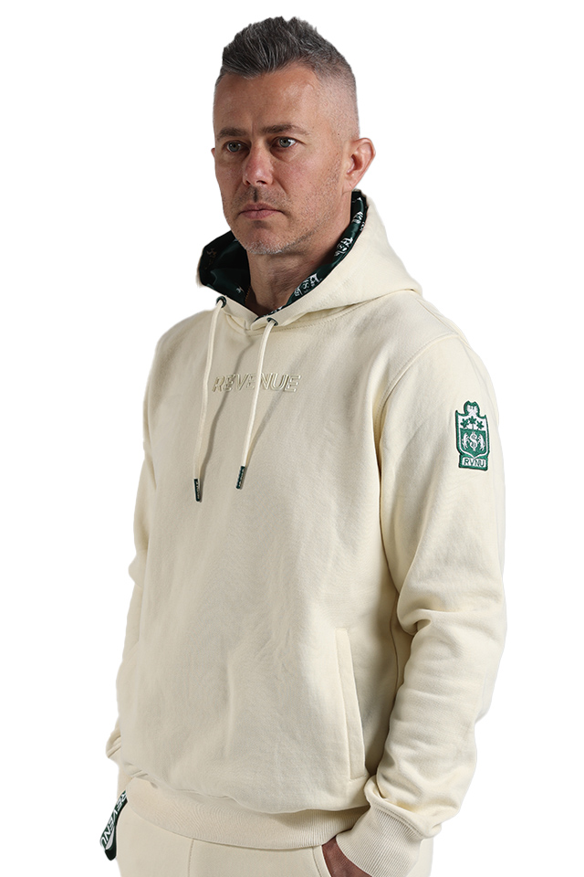 Every detail reflects REVENUE BRAND’s uncompromising approach to modern luxury. The hood is lined with art-silk, offering a smooth contrast against the hoodie’s rich exterior, while custom metal-finished drawcord tips stamped with the REVENUE insignia add discreet refinement. At the front, our signature nylon tag—embossed with tonal rubber REVENUE lettering—anchors the piece in the brand’s identity, a quiet statement recognized by those who know. Finally, the hoodie is crowned with the embroidered REVENUE BRAND crest on the upper sleeve, a mark of authenticity and prestige.