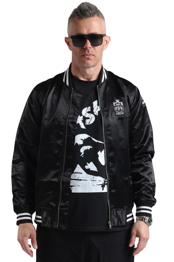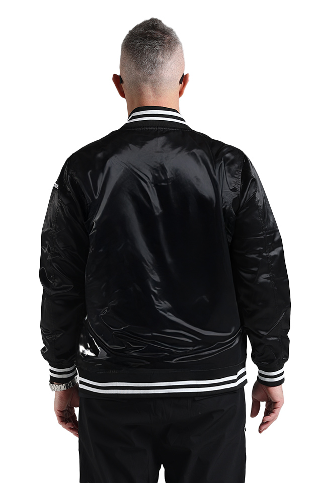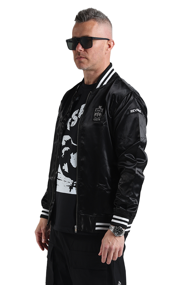 The design commands presence through bold detailing. A large REVENUE crest embroidered on the chest anchors the jacket in prestige, while the full REVENUE wordmark stitched along the sleeve makes a confident statement of identity. Finishing touches — from the logo-engraved zipper to the ribbed black-and-white striped cuffs and waistband — underscore the jacket’s balance of heritage and modern luxury.