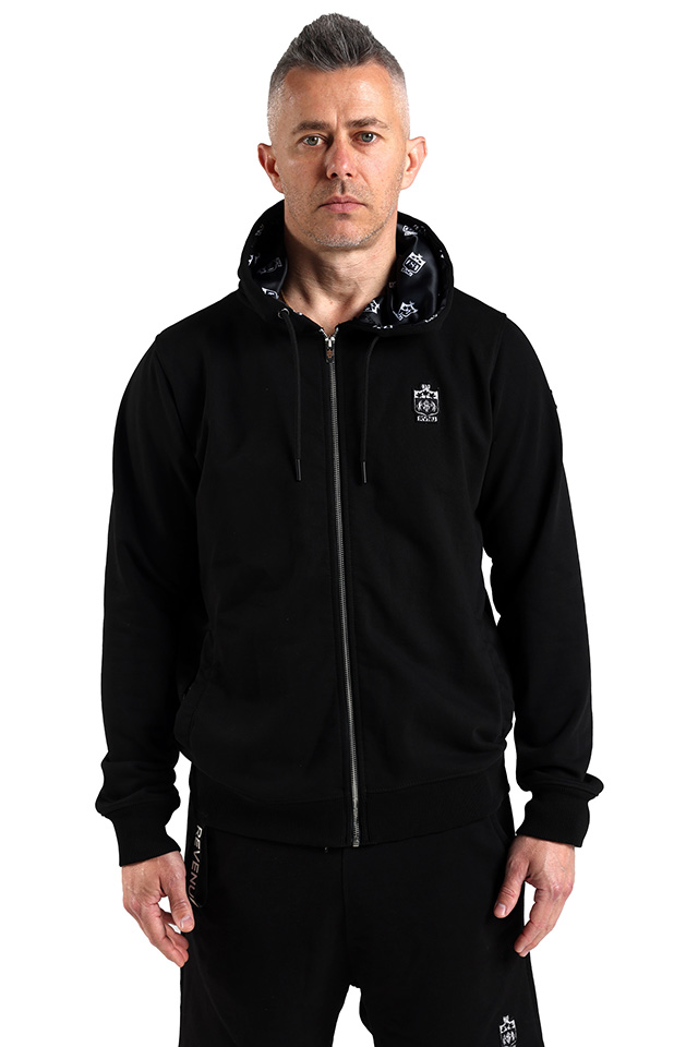 The RESTRICTED embroidered logo Zip-Up Hoodie on black colour base.