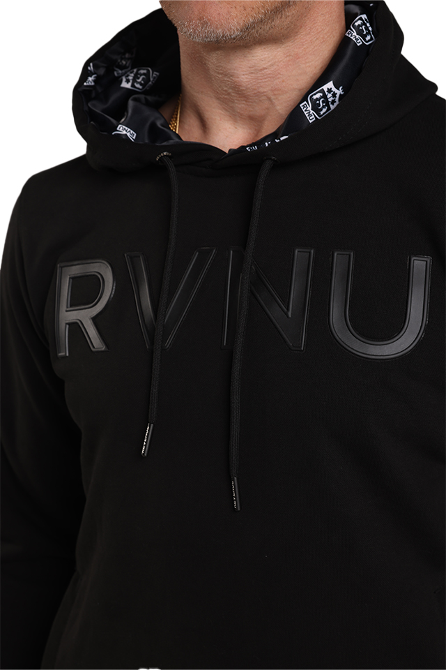 The RVNU black liquid rubber logo Hoodie on black colour base.